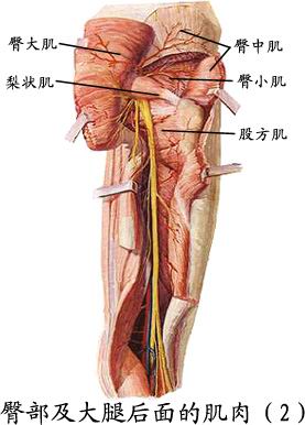 (2)臀大肌:位于臀部浅层,大而肥厚,其外上1/4部无重要血管神经,是临床肌肉注射的常用部位。作用于髋关节,使其后伸和旋外。