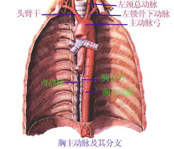 呈弓状凸向上,凸侧发出三大分支自右至左依次是头臂干、左锁骨下动脉、左颈总动脉。头臂干又分为右锁骨下动脉、右颈总动脉。左右颈总动脉分布于头颈部。左右锁骨下动脉分布于上肢。