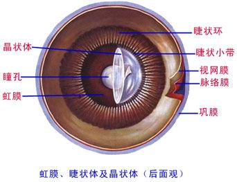 (2)睫状体:虹膜后方,为血管膜增厚部分,与晶状体之间有睫状小带相连。内含睫状肌,收缩时睫状小带放松,舒张时睫状小带拉紧。
