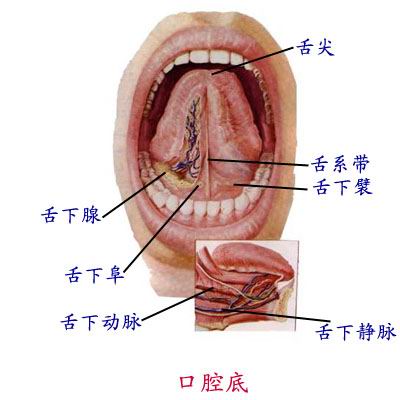 舌位于口腔底,以“ V”形界沟分为舌前2/3的舌体和舌后1/3的舌根。舌的构造主要包括舌粘膜和舌肌。
