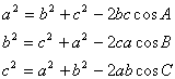 7. 正弦定理: 在一个三角形中,各边和它所对角的正弦的比相等,即: 8. 余弦定理: 三角形任何一边的平方等于其他两边平方的和减去这两边与它们夹角的余弦的积的两倍,即: