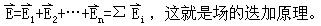【场的迭加原理】如果一个电场由n个点电荷共同激发时,那么电场中任一点的总场强将等于n个点电荷在该点各自产生场强的矢量和即