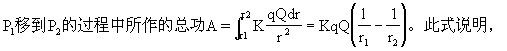 当电荷q在点电荷Q的场中运动时电场力所作的功只取决于运动电荷的始末位置,而与路径无关。任何电荷在静电场中的电势能的数值是由该电荷和电源电荷以及它们之间的相对位置所决定。电荷在匀强电场中移动时,场力所作的功可以从功的定义直接计算,即W=FScosθ=qFScosθ。也可以根据电势能的变化来计算,即W=ε始—ε终,对不均匀场,一般采用电势能的变化来计算比较方便。由于电势能等于电量q和电势U的乘积,所以电场力所作的功也可以写成为