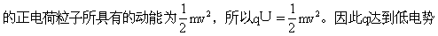 【电场中的带电粒子】在静电场中的带电粒子总是沿着电场方向或逆着电场方向受到电场力的作用。带正电荷的粒子所受的力是沿电场方向的,带负电荷的粒子所受的力则沿着电场的反方向。也就是说,带正电荷的粒子从电势高的地方向电势低的地方做加速运动。而带负电荷的粒子则从电势低的地方向电势高的地方做加速移动。例如带正电粒子从高电位开始运动到低电位。如果高电位与低电位之间的电势差为U,则在这段运动期间,电场力作功为W,则W=qU。到达低电势时质量为m