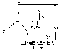 把三相电源三个绕组的末端X、Y、Z连接在一起,成为一公共点O,从始端A、B、C引出三条端线,这种接法称为“星形接法”又称“Y形接法”。如图3-72所示。从每相绕组始端引出的导线叫做“相线”,又称“火线”。图3-72中的O称为“中性点”。从中性点引出的导线称为“中性线”,简称“中线”。这种具有中线的三相供电系统称为“三相四线制”。每相相线与中线间的电压称为“相电压”,其有效值分别用VAO、VBO、VCO)表示。每两根相线之间的电压称为“线电压,其有效值分别用VAB、VBC、VCA表示。相电压的正方向规定为自始端到中性点。线电压的正方向,例如VAB的正方向,规定为自始端A到始端B。如图3-73中的箭头所示。星形接法,相电压和线电压显然是不同的,且各相电压之间的相位不同,故在计算相电压和线电压之间的关系时应用矢量方法计算。例如,线电压VAB应该等于相电压