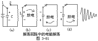 【电磁振荡】 由电路本身所具有的电场和磁场能量之间交互变化而产生的振荡,称为“电磁振荡”。电磁振荡的过程也是电路中的电流以及电容器极板上的电压,在最大值和最小值之间随时间作周期性往复变化的过程。能产生振荡电流的电路叫做“振荡电路”。最简单的振荡电路是由一个自感线圈和一个电容器串联而组成的回路,简称LC回路。如图3-81所示。即由电感L和电容C组成的振荡回路。振荡回路主要作用是使振荡器产生频率一定的正弦波。把图3-81a中的开关K倒向“1”,电池先向电容C充电,经过一段时间之后,把K从“1”移到倒向“2”,这时,回路中就发生了电磁变换现象,如图3-81b所示,其过程是先由充了电的电容C向电感L放电,在电容器向电感放电的时间内,原来充在电容器中的电能逐渐变成电感中的磁能。当电容器上的电荷放完时,C两端电压降至零,这时虽然C上不再放电了,但是我们知道通过电感线圈的电流是不能突变的,或者说,流过线圈的电流不可能一下子消失,因此电流仍按原方向继续流动。维持电流继续流动的是线圈中所贮存的磁场能量。当电流在回路中继续流动时,L就反过来向C充电,于是在电容器两端重新出现电荷,但电容器上的电压极性和原来相反,如图3-81c所示,在L向C反向充电的过程中,L中的电流逐渐减小,C上的电压逐渐增大,线圈的磁能又逐渐变成电容器的电能。当L中的电流减小到零时,线圈周围的磁场消失,磁能全部转变为电能,之后C又向L放电,如图3-81d。与前一过程比较,只是此时电容放电电流的方向相反了,其余过程与前一过程一样,回路中电流如此反复循环的现象,就是回路中产生了的电磁振荡。由此可见振荡实际上是回路中的电磁交替变换过程。通过这种过程,回路把原来的直流电能变换成交流电能,回路两端就有正弦交流电压产生,称为振荡电压,如图3-81所示。LC电路在振荡过程中,如果不再从外界获得能量,就会以一个固有的频率作振荡,该振荡频率称为振荡电路的固有频率;所对应的周期称为固有周期。电路的固有周期和固有频率,只和LC回路的电容和电感的大小有关,即