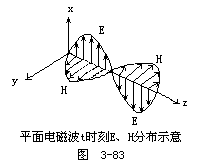 【电磁波】 在高频电磁振荡的情况下,部分能量以辐射方式从空间传播出去所形成的电波与磁波的总称叫做“电磁波”。在低频的电振荡中,磁电之间的相互变化比较缓慢,其能量几乎全部反回原电路而没有能量辐射出去。然而,在高频率的电振荡中,磁电互变甚快,能量不可能全部反回原振荡电路,于是电能、磁能随着电场与磁场的周期变化以电磁波的形式向空间传播出去。电磁波为横波。电磁波的磁场、电场及其行进方向三者互相垂直。如图3-83所示。电磁波的传播有沿地面传播的地面波,还有从空中传播的空中波。波长越长的地面波,其衰减也越少。电磁波的波长越长也越容易绕过障碍物继续传播。中波或短波等空中波则是靠围绕地球的电离层与地面的反复反射而传播(电离层在离地面50~400公里之间)。振幅沿传播方向的垂直方向作周期性交变,其强度与距离的平方成反比,波本身带动能量,任何位置之能量功率与振幅的平方成正比。其速度等于光速(每秒3×1010厘米)。光波就是电磁波,无线电波也有和光波同样的特性,如当它通过不同介质时,也会发生折射、反射、绕射、散射及吸收等等。在空间传播的电磁波,距离最近的电场(磁场)强度方向相同和量值最大两点之间的距离,就是电磁波的波长。电磁波的频率γ即电振荡电流的频率,无线电广播中用