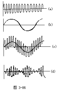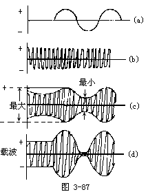 【调幅】 调幅是借声频信号或视频信号的强度(大小)变化迫使射频载波的振幅随之变化。由单一声频电波所形成的振幅调制,如图3-86所示。假设图3-86a为1兆赫的载波,图3-86b为1千赫的单音。如果将载波及单音的声频电波同时加在一个电阻上,其合成的波形则如图3-86c所示,此时载波的振幅完全没有改变,只是其每周电波之瞬间极性有连续的改变而已,显然,这不是振幅调制,一无线电收音机无法判定这种信号的瞬时极性,所以也无法播出声音信号来。图3-86a是所要调幅的信号的载波,此种已调幅的载波是将载波与声频电波同时加在一电路上,但电路的电流与所加的电压不是正比关系,也就是此电路是非线性的,不能用欧姆定律来解释。为了达到调幅的目的必须利用非直线型电路。当电子管作用于特性电线的非直线部分时,电子管可说是一个理想的调制器。功率放大器的失真,是由非直线的电子管特性曲线所引起的。在某种意义上看,也可将振幅调制当作振幅失真来看,所以造成失真或调制,必须要一个非直线型电路。当电子管作用于特性曲线的非直线部分时,电子管可说是一个理想的调幅器。图3-86d是仅由两个额外频率的电波所形成的调幅载波,一个是1001千赫,也就是等于载波频率1000千赫与声频电波频率1千赫的和;另一个是999千赫,也就是载波频率1000千赫与声频电波频率1千赫的差,1001千赫的频率,称为高旁频率,999千赫的频率被称为低旁频率。在无线电波广播方面,调制载波的声频电波频率范围可达10 000赫(10千赫),每一声频电波频率都能产生一个高旁频率及一个低旁频率,因此各声频频率所产生的总高旁频率与总低旁频率,就形成两个频带,一为高旁频带的最高频达1010千赫(对10千赫声频电波而言,低旁频带的最低频率达990千赫。因此借1000千赫载波以传送声频频率达10千赫范围内的电波时,发射频道这频带宽度必须有20千赫(从990~1010千赫),这不只对声频电波而言,就是对视频电波的传送,也是如此,就一般频道的总频带宽度言,也都是所需传送信息电波频率宽度的二倍。由此可知发射机及接收机的调谐放大器,不只通过射频载波一个频率,必须能通过整个频带宽度方可。为了能从已调幅的载波获得信息,所有的发射机及接收机电路,必须能通过具有高旁频带及低旁频带的全部频带。调谐电路必须具有选择能力,使所需的频带通过,并排斥不需要的频带。只讨论一些对载波振幅变化的原理还是不够。调制的程度是一个非常重要的因素,因为正是调制程度决定被传送的信号的强度及特性。图3-87是各种不同程度的调幅载波。图3-87a是声频调制信号电波。图b是未被调幅的载波。调制深度很低的已调载波则示于图3-87c,已调载波的振幅大小变化,完全随声频调制信号的变化而改变。但其振幅变化的程度较小。接收机的检波器之输出,只对载波的振幅变化有相应变化,而对载波的绝对大小无关。已调制载波的调幅程度很小时,声频信号将不会太大,并且此信号可能会被较强的杂波所湮没。如果调制深度大,声频信号一定非常强而又清晰。图3-87d的射频载波,已经被调制到最大的可能程度,振幅的最大值,是原来未经调制前载波振幅值的二倍,称为百分之百的调幅。如果调幅信号(即声频信号)电波的振幅再增大的话,所接收的信号电波,将产生失真的现象。