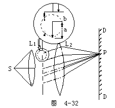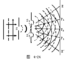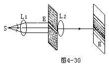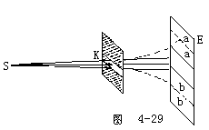 【光的衍射】光绕过障碍物偏离直线传播而进入几何阴影,并在屏幕上出现光强不均匀分布的现象。这种现象也体现了光的波动特征。光的衍射现象是光的波动性的最直接,最有力的实验证据。牛顿的微粒模型难以说明光绕过障碍物时发生的弯曲现象,衍射现象只能用波动说解释。根据惠更斯一菲涅耳原理,不仅可以对光绕过障碍物边缘偏离直线传播的现象作一般性的解释,而且能定量分析衍射图样的发光强度分布。光屏上任意一点的发光强度可根据次波迭加推算出来。因此光的衍射现象是光的波动性的最直接、最有力的证据。如图4-29所示,K是一可以调节的狭缝。从光源S发出的光线,穿过K后,在屏幕E上呈现光斑ab。在S、K、E三者的位置已经固定的情形下,ab的宽度是由缝的宽度决定的。当狭缝从一定的宽度逐渐缩小时,穿过缝的光束也逐渐变窄,在屏幕E上的光斑ab随之变窄,但是当缝K缩小到一定程度时,屏幕上的光斑不仅不变窄,反而增宽,如图中a′b′所示。而且光斑的全部亮度也将发生变化,由原来的均匀分布变成一系列明暗条纹。光斑的边缘也将失去明显的界限,变得模糊不清。应当指出。在图4-29中所示的衍射实验装置中,狭缝距光源和屏幕都很近,所以入射光和衍射光均是非平行光束。在光学中,通常把入射光或衍射光不是平行束的衍射,称为菲涅耳衍射。图4-29所示的单缝衍射情况就是一种菲涅耳衍射。在另一些装置中,如果入射光和衍射光都是平行光束,那末,这种衍射称为夫琅和费衍射。显然,观察这种绕射现象需要利用透镜。