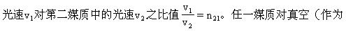 【折射率】 表示在两种(各向同性)媒质中光速比值的物理量。光从第一媒质进入第二媒质时(除垂直入射外),任一入射角的正弦和折射角的正弦之比对于折射率一定的两种媒质是一个常数。这常数称为“第二媒质对第一媒质的相对折射率”。(n12),并等于第一媒质中的