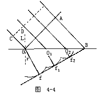 【折射定律的解释】 折射定律的解释,是利用原始形态的惠更斯原理。这种形式的惠更斯原理,实质上是几何光学的原理,并且严格地说,只有在几何光学适用的条件下,也即在光波的波长和波阵面的线度相比为无穷小时,才能够加以应用。在这些条件下,它使我们能够导出几何光学的折射定律。假设以v1表示第一种媒质中的光波速度,以v2表示第二种媒质中的波速。设i是波阵面的法线OC与折射媒质表面的法线OD之间的夹角,见图4-4。设在时刻t=0,波阵面的C点到达媒质表面时,和点O重合,则在波阵面从A′点到达第二种媒质(点B)所需的时间为τ,次波便从作为中心的点O出发,传播到某一个距离Of。以点O1,O2等为中心的各个次波,到指定时刻都传播到相应的距离,在第二种媒质中给出许多元球面波f1、f2……。按照惠更斯原理,诸元波的包络面,即平面Bf2f1f,指出波阵面的实在位置。显然