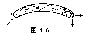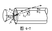 【光导纤维】 光导纤维是利用全反射规律而使光沿着弯曲途径传播的光学元件。它是由非常细的玻璃纤维组成束,每束约有几万根,其中每根通常都是一种带套层的圆柱形透明细丝,直径约为5~10微米,可用玻璃、石英、塑料等材料在高温下控制而成。它已被广泛地应用于光学窥视(传光、传像)和光通讯。光导纤维的结构如图4-6所示,内层材料选取的折射率大,外层材料的折射率低,就是要在内外层之间的界面上产生全反射,以保证光的传输效率。如图4-7所示,单箭头线表示临界光线,它在内外层分界面上的入射角等于或小于临界角A。若在折射率为n0的媒质中入射角大于i0的那些光线(以双箭头表示),在n1、n2分界面上的入射角就小于A,这些光线无法通过纤维而在其中传播。只有在媒质n0中其顶角为2i0的锥体内的全部光线才能在光学纤维中传播,根据临界角的定义。