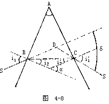 【棱镜的偏向角】 光通过一三棱镜的偏向角等于入射角与出射角之和减去棱镜的折射棱角。如图4-8所示。a为棱镜的折射棱角,当光束SB入射到棱镜时,经连续发生两次折射,出射光线(CS′和入射光线SB之间的夹角,叫做偏向角“δ”。由图不难看出: