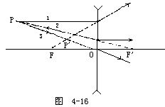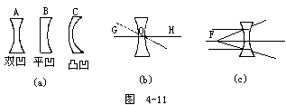 【凹透镜】 两侧面均为球面或一侧是球面另一侧是平面的透明体,中间部分较薄,称为四透镜。分为双凹、平凹及凸凹透镜三种,如图4-11a所示之A、B、C。其两面曲率中心之连线图4-11b所示之G1H,称为主轴,其中央之点O称为光心。通过光心的光线,无论来自何方均不折射。图4-11c表示,平行主轴之光束,照于凹透镜上折射后向四方发散,逆其发散方向的延长线,则均会于与光源同侧之一点F,其折射光线恰如从F点发出,此点称为虚焦点。在透镜两侧各有一个。凹透镜又称为发散透镜。四透镜的焦距,如图4-12所示。是指由焦点到透镜中心的距离。透镜的球面曲率半径越大其焦距越长,如为薄透镜,则其两侧之焦距相等。