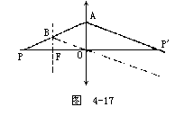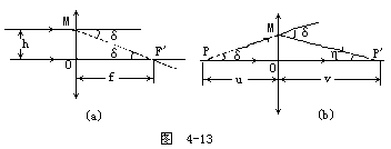 当主轴的物点P发出的任一近轴光线PM入射到透镜的M点时,图4-13b所示,在理想成像的条件下,出射光线MP′和主轴的交点P′为像点,此时偏向角也应相同。令物距OP=u,像距OP′=v,由图b中的几何关系可知