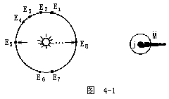 因此,每经过此一周期之间隔,M便再次进入木星J之阴影中,而使地球上的观察者暂时无法看到它。罗默发现,当地球E环绕太阳S作公转