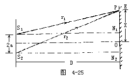 设N1和N2分别为S1和S2在屏幕上的投影点,O为N1和N2的中点,并设OP=x。从图中直角三角形S1PN1和S2PN2,可知
