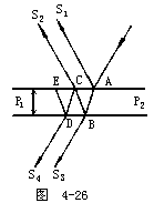 【薄膜干涉】水面上的薄层油膜,机动车在潮湿柏油道上所遗留下来的油迹,或是肥皂泡等,都会在白光中出现灿烂的彩色。所有上述的各例中,均是由薄膜干涉现象引起的。若将一用金属细丝制成的矩形框架,浸以肥皂水形成一层薄膜,然后用弧光灯的白光或阳光照射于其上,就呈现出典型的薄膜干涉。其中一部分是由反射光产生的干涉条纹,而其余的则从皂液膜中透过去。此时从反射光中可以看到许多与水平框架上缘平行的彩色横条纹。不但如此,这些横条纹还会慢慢地向下移动,愈靠近框架上缘则愈宽。此外,透射光在白幕上也显示出许多彩色横条纹,但比起反射光中的条纹要暗淡得多。如果用单色光代替白光,则彩色现象会立即消失,而出现的便是一些彩色条纹的花样类似于明暗相间的条纹。在1800年英国科学家杨格指出薄膜彩色条纹之形成,是因为干涉现象所致。如图4-26,SA是一束单色光,斜射到厚度为d之皂液薄膜P1P2上。照射于A处之光线S(实际上它代表的是一个光束),一部分立即被反射,而另一部分则折射到B处。反射部分以S1来表示,折射至B处者又会照样地有一部分立即被反射,及另一部分被折射。后者仍用S3来表示。被反射的光线抵达C处,又在该处分为两部分,一部分折射为平行于S1之S2,另一部分被反射后则沿CD路线而抵达D处。然后再在该处被分为两部分,一部分折射为平行于S3之S4,另一部分则被反射到E处。关于薄膜上所发生之干涉现象(单色光),如果有两条平行入射到薄膜上,如图4-27中的a和b,b在薄膜上表面的反射光线为b1,a由膜的上表面折射到下表面的C点再反射到B点,又折回a1与b1重合。我们可以计算出aa1和bb1之间的光程差。对薄膜来说,AB的长度比光源S到薄膜的距离小得很多,因此∠BSA非常小,可以认为SA和SB是相互平行的。作AD⊥SB,可以认为SA=SD,也就是说从S发出的这两条光线分别到达A点和D点时,光程是相等的。从图中可以看出,光线a在薄膜(折射率为n2)中经历路程ACB到达B点,而光线b在原媒质(折射率n1<n2)中经历路程DB而在B点反射。所以这两光线之间的光程差