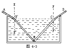 【光的折射】 凡光线在通过疏密不同介质交界面时改变方向的现象,称为光之折射。如图4-3所示,光线AB由空气内斜向射至水面,自入射点B起,就向这点的法线EE′偏折而取BM的方向。若在水底置一平面镜M,使反射线MC再由水中透入空气,则自入射点C起,离开法线FF′偏折,而取CD的方向。偏折后的光线BM和CD,称为折射线,折射线和法线所成的角,如∠E′BM和∠FCD,称为折射角。由此可知光线由稀的介质入射到密的介质时,折射线常向法线偏向,故折射角常比入射角小;若由密的介质透入稀的介质时,折射线常离法线而偏向,折射角常比入射角大。当光线通过介质的密度在不断变化时,光线前进的方向也随之而改变,因此我们隔着火盆上的热空气看对面的东西时,会觉得那东西不停地在闪动着。这是由于火盆上面的空气因受热很快地上升,这部分空气的密度便和周围空气的密度不同,而且热度还不断在变化,当由物体射来的光线通过这样的空气,其折射光线的路径不断发生变化,就会使物体变成了闪动的形状。在炎夏中午时分,假使躺在地上来看树木、房屋和人物,它们的轮廓好像是透过一层流动的水一样,而且动摇不定。这是因为那时十分炎热,地面的辐射热很多,温度高,接近地面的空气受热,密度变小,因而上升,成为向上流动的气流,由物体射来的光线通过这种变动着的气流折射光线的路径就不断改变,因此所看到的物便都动摇不定。我们在夜里看到天空中恒星的闪动,也是这个道理。大气里经常存在着密度不同的气流和旋涡,当恒星的光线通过这种气流时,就会使它原来折射的路径发生变化,一会儿到左,一会儿到右,恒星是不会闪动的,都是这折射光造成的。又如太阳位于地平线附近时,光之折射作用尤大。在地平线下的太阳,阳光从太空(真空)平射至逐渐变化的光密媒质空气中而发生的折射,光线传到地面是一曲线,因为光之折射的关系,太阳看上去就如同刚刚接触到地平线的下缘一样,其实它业已落至地平线以下了。同理,当太阳刚刚还在地平线下的时候,看上去它已升起来了。所以我们可以说:太阳实际上比我们肉眼所见的要落得早些而起的迟些;这等于说,光之折射将我们的白天稍稍加长了一点。