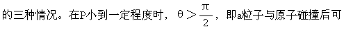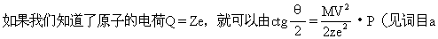 【a粒子的散射】 1911年卢瑟福等人用a粒子(He的原子核)射击重的金属箔,结果大部分a粒子穿过了金属箔而很少改变其运动方向,一少部分a粒子被分别散射到不同的方向上。他们测定了不同散射角中a粒子的数目,加以分析后,得出如下结论:原子是由一个很小的核心(原子核)和围绕着它运动的电子构成(原子行星模型),原子核所带电荷量为Ze(Z为该金属的原子序数,e为电子的电荷),其线度约为原子的十万分之一,一般为10-13~10-12厘米,a粒子散射,又称为卢瑟福散射,它是原子物理发展中最早期的重要实验之一。图5-1所示描述了a粒子通过重金属箔的散射情况。假设距原子核很远的地方,a粒子沿直线ab以速度V运动,以P表示直线ab与原子中心O(即原子的正电荷E所在的地方)的最短距离。P被称为“瞄准”距离,可由理论力学应用电学知识计算证明,在a粒子与电荷E之间存在着库仑相互作用力的情况下,a粒子沿双曲线运动。而a粒子轨道的偏转角θ(双曲线的渐近线之间的角)为下式决定: