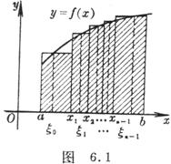 [Definite integral·Riemann integral] Set the function f ( x ) on the interval [ a , b ] . Divide the interval [ a , b ] into several parts by any method , and let λ be ( i = 0, 1, 2, ... , n - 1) . Take any point ( i = 0, 1, 2, ... , n - 1) in each small interval [ ], and make a sum ( Figure 6.1 ) . When λ → 0 , if the limit ![]()